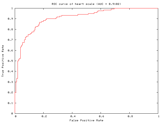 This tool which gives the ROC (Receiver Operating Characteristic) curve and AUC (Area Under Curve) by ranking the decision values. Note that we assume labels are +1 and -1. Multi-class is not supported yet.