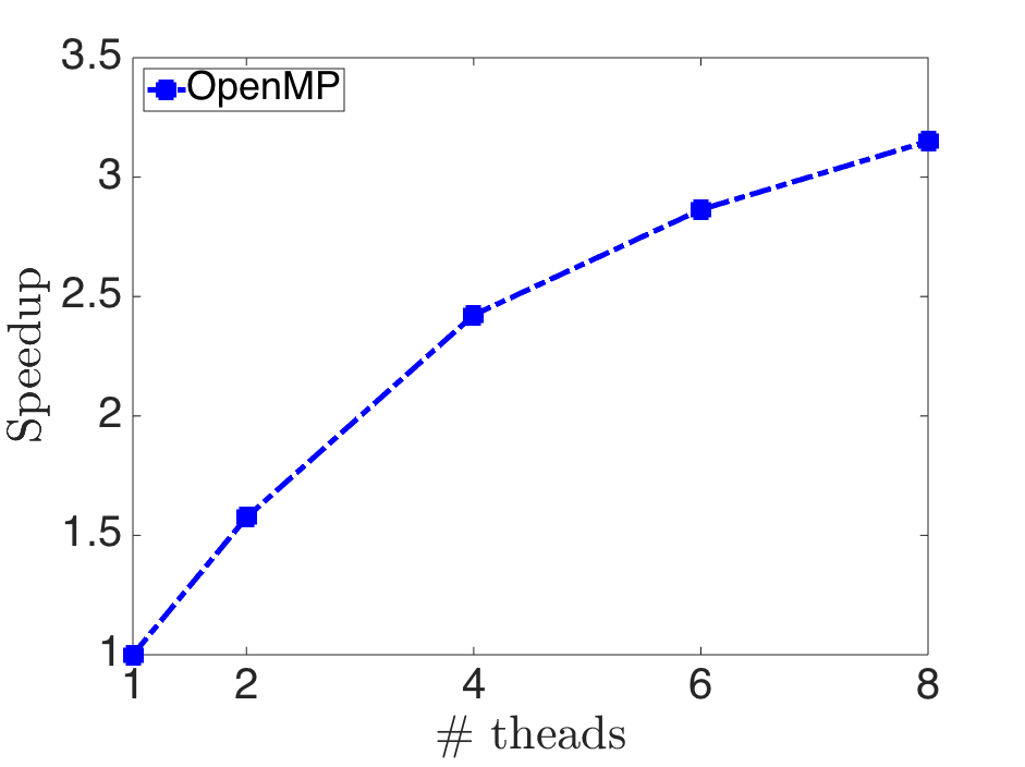 > ./train -s 3 -m 8 rcv1_test.binarywill run L2-regularized l1-loss SVM with 8 threads. Here we exclude the loading time Training time on rcv1_test.binary is as follow: Original LIBLINEAR-2.1: 1.935(sec) This extension with 1 threads: 2.337(sec) This extension with 2 threads: 1.566(sec) This extension with 4 threads: 1.107(sec) This extension with 8 threads: 0.946(sec) Training time on epsilon_normalized is as follow: Original LIBLINEAR-2.1: 12.759(sec) This extension with 1 threads: 19.874(sec) This extension with 2 threads: 12.241(sec) This extension with 4 threads: 8.449(sec) This extension with 8 threads: 7.493(sec)