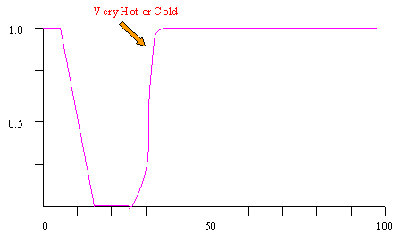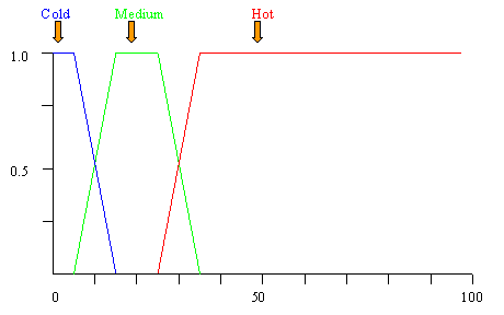 The fuzzy value that we created, temperature is very hot or cold, will have a physical depiction as follows:
