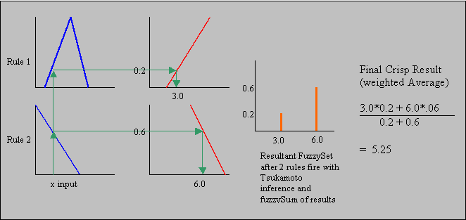 Where x and y are the current crisp values of X and Y. Each of the outputs is calculated and the result is a weighted average of the outputs, with the weights (wi) being the degree of matching of the LHS of the rules. So the final crisp value of this set of rules is: